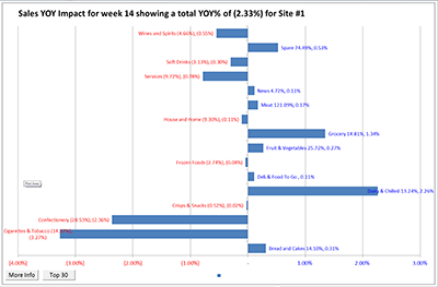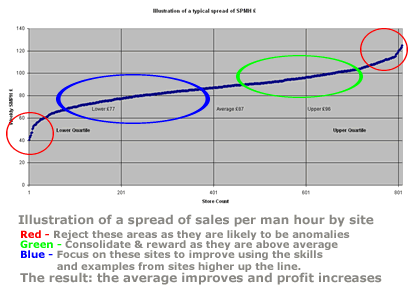 In our experience companies spend large sums on consultancy and software, plus the inevitable hardware upgrade, when they already have the information they need. Significant improvement can be achieved by simply analysing the data and focusing on the elements that are performing below average. The example illustrated here is a simple but very effective way of highlighting the targets for improvement [float the mouse over the image]