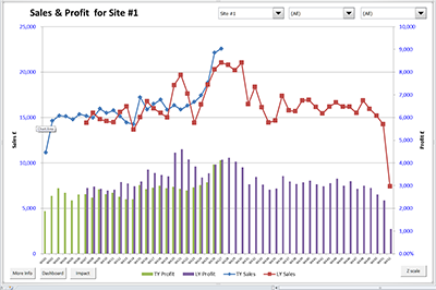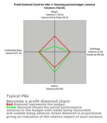 The example on the left takes a simple P&L for a site and, using the same data, creates a proportional Profit Diamond that highlights the areas of success and also the relative impact of each of the key variances [float the mouse over the image].